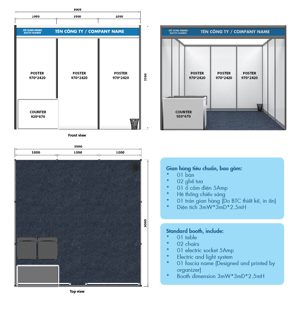Gian hàng tiêu chuẩn 9m2 (3mD x 3mR x 2.5C), chi tiết bao gồm như sau: